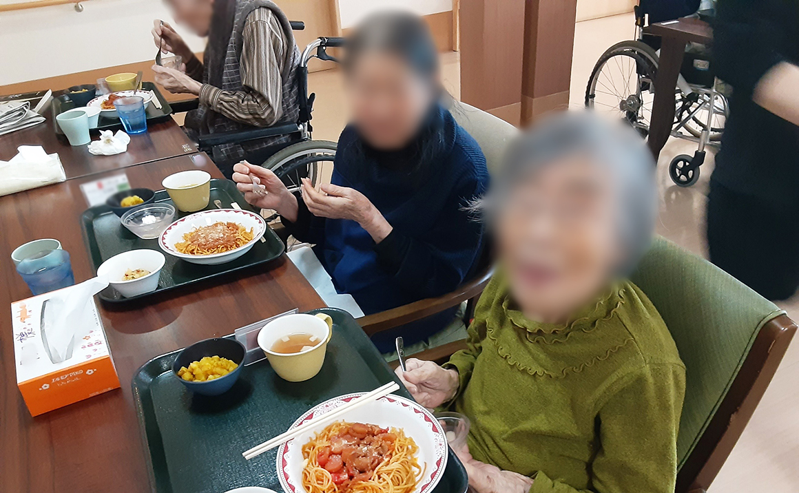 プレザンメゾン習志野実籾のお食事の様子です(*^。^*) 今回の昼食メニューはナポリタンでした!「戦争中は洋食が食べられなかったから、今食べられて夢のよう!」 と戦時中を思い出しているご利用者もいらっしゃいました。