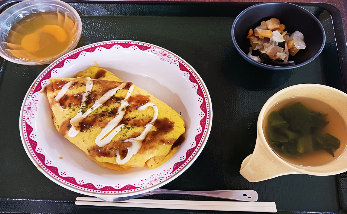 プレザンメゾン習志野実籾の今日のお昼ごはんの様子です🍚!! 「わぁーすごーい!」と笑顔が見られた今日の献立は、、、 【オムそば・彩野菜とセロリのマリネ・コンソメスープ・みかんゼリー】です☆彡