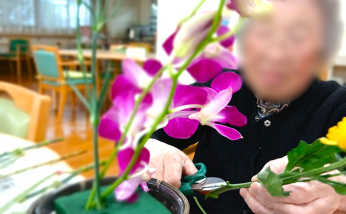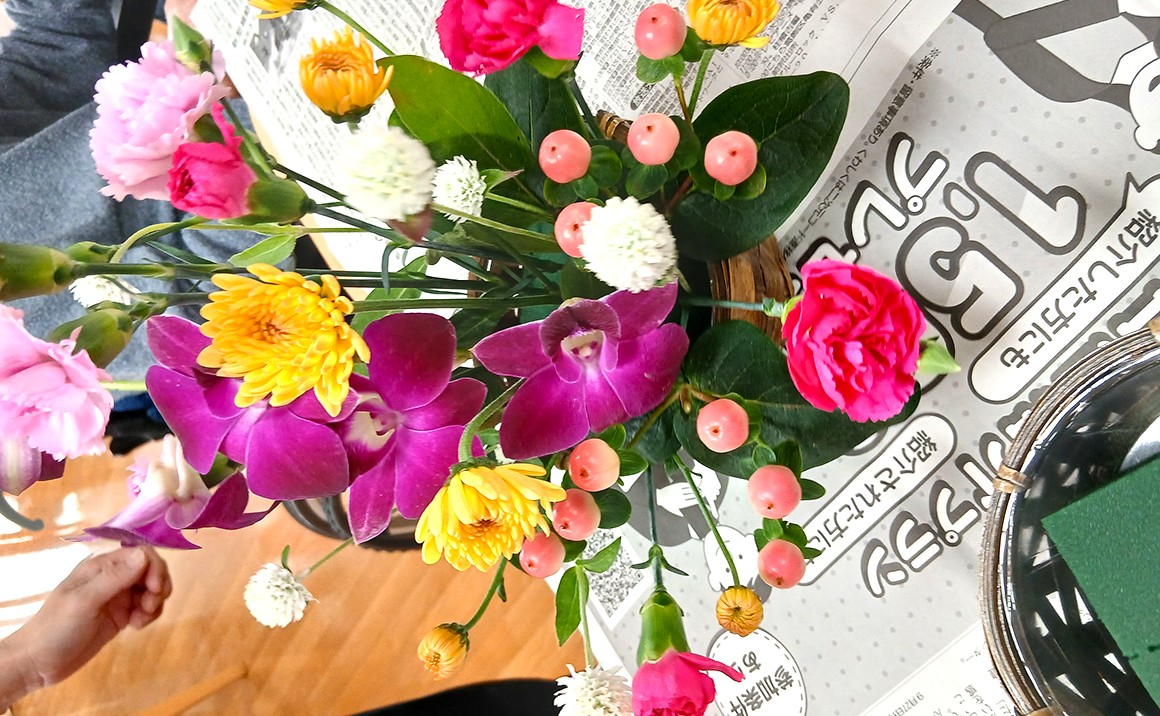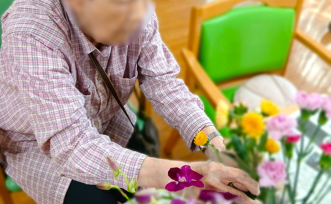 色とりどりの花を前に、入居者様は配置を考えながら楽しまれ、完成後は「きれい!」「部屋に飾りたい!」と笑顔がおおくみられました!