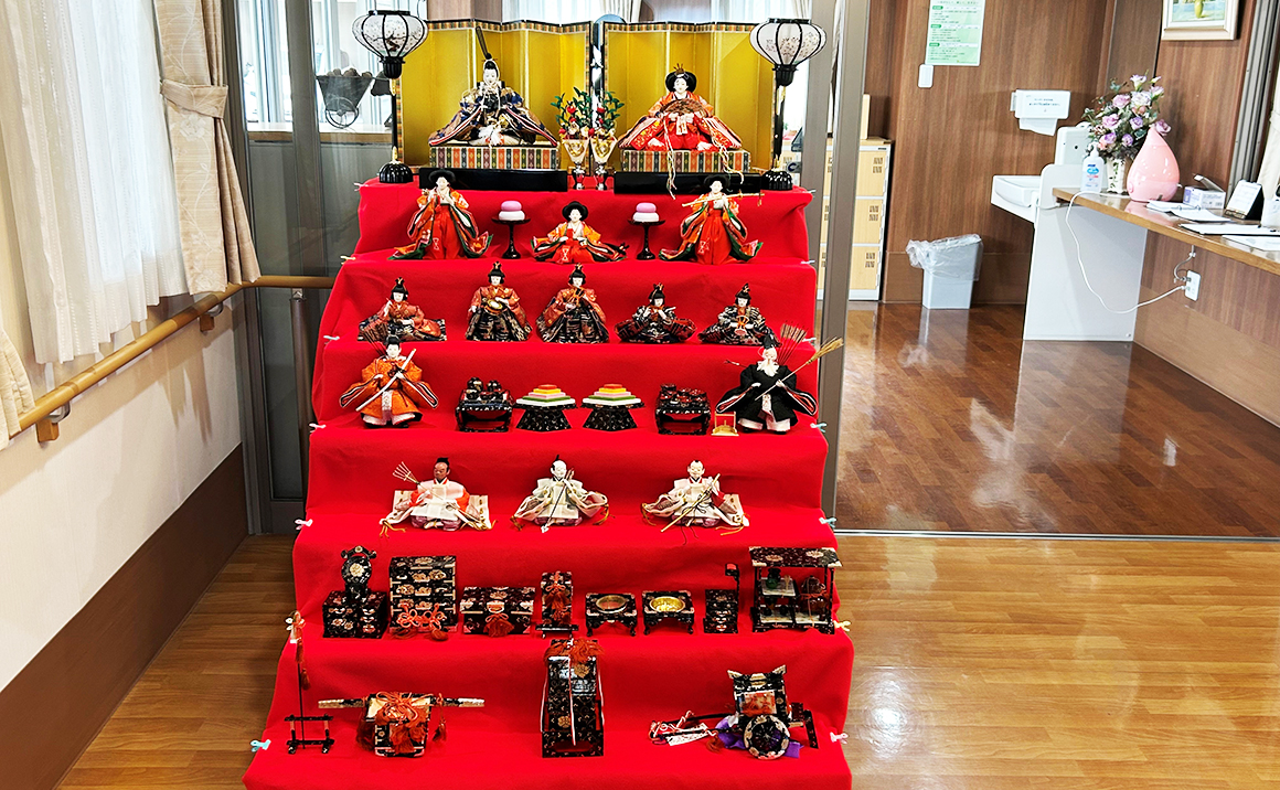 玄関入ってすぐのところに、お雛様を飾りました。 7段の立派なお雛様です。 EV降りたらすぐに入居者様が目につくところに 飾らせていただいたので、入居者様から 「わぁ」「懐かしい。可愛い。」 と歓声があがりました。