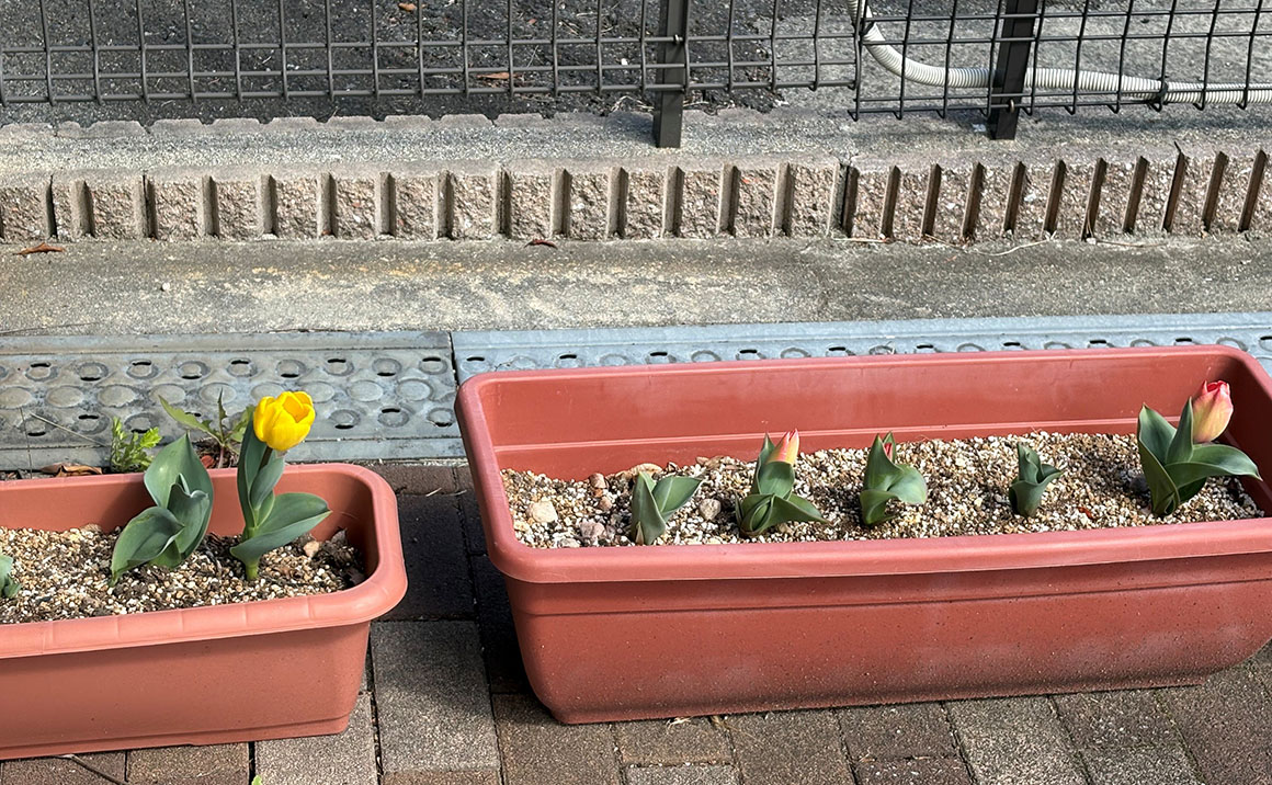 12月に入居者様と植えたチューリップが咲いてきました。 赤が多いですが、黄色が1番に咲いてくれました。 毎日少しずつ成長する姿を 入居者様と楽しみに待っていました。 入居者様も笑顔で「やったあ」と喜んで下さいました。