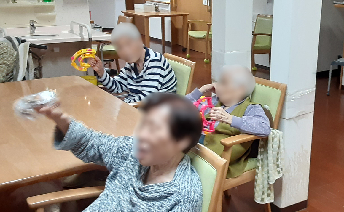 雨が続きどうしても室内で過ごす日が多いこの時期、たのしい家佐太中町では少しでも入居者様方に楽しんで頂けるようサンバレクリエーションを企画いたしました。 黄金の衣装に身を包んだスタッフが、マツケンサンバを熱唱! これには入居者様方大喜びで、歌に合わせて手に持つ楽器でリズムに合わせて打ち鳴らしていました。 これからも楽しく活気に満ちた日々を送っていただけるよう様々な催しを企画していきます。