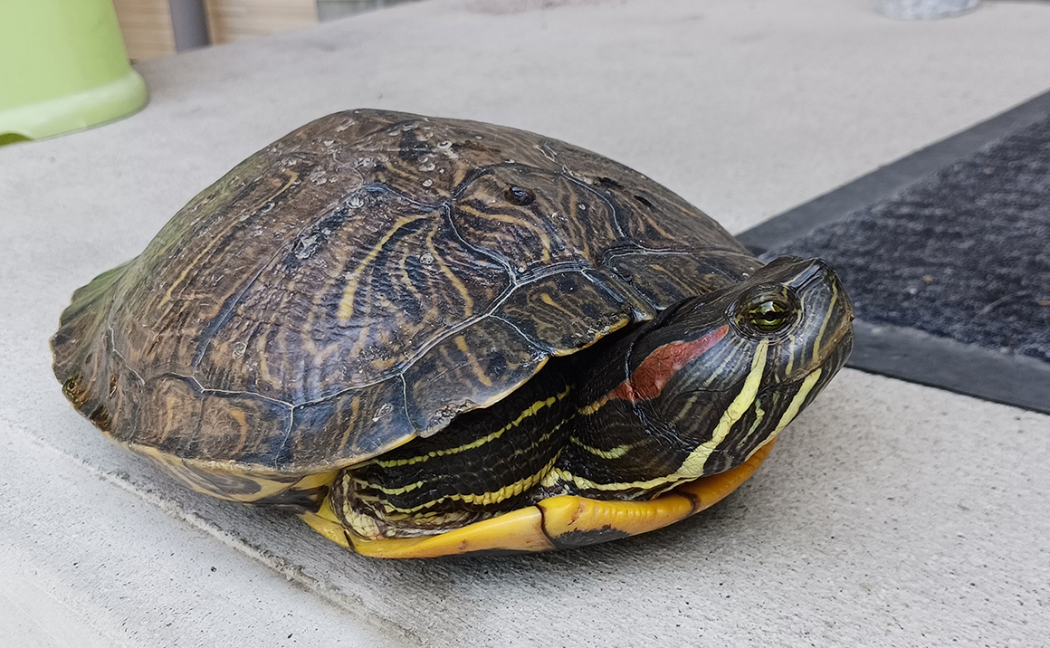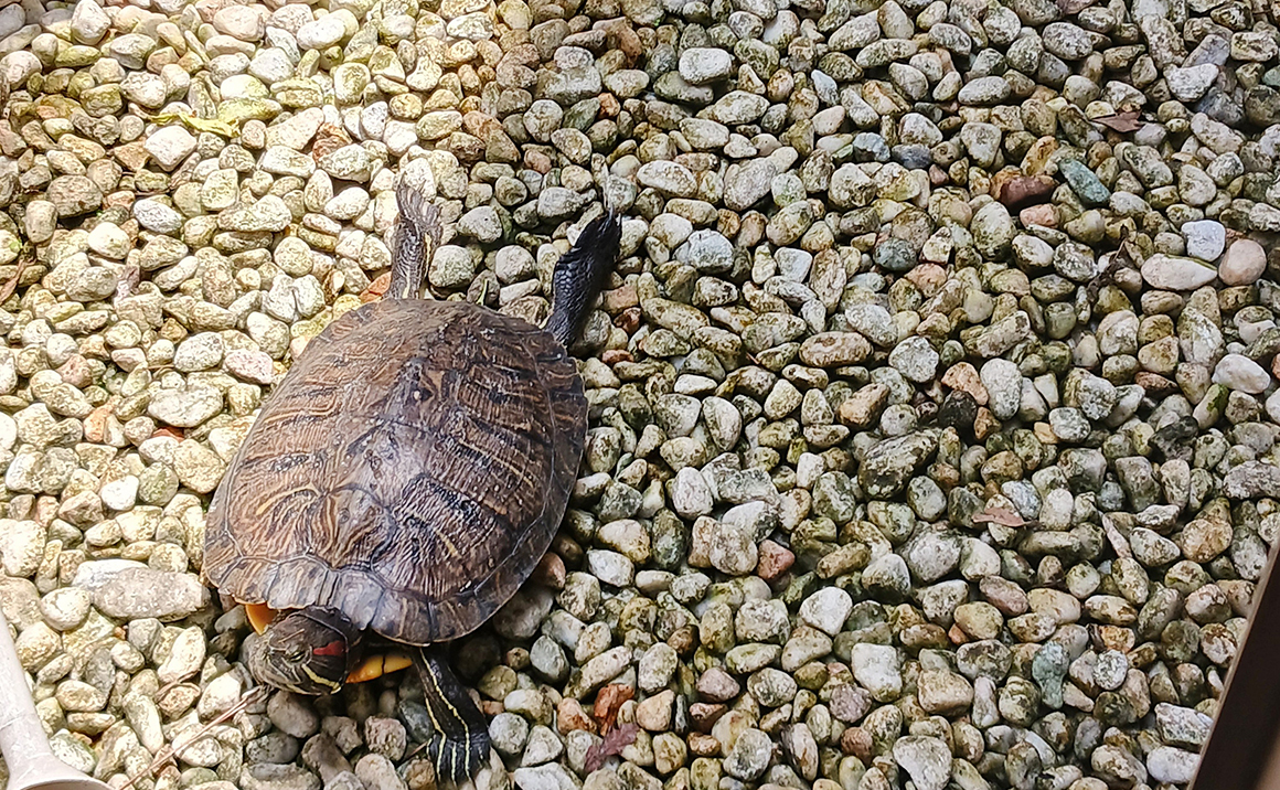 甲羅が20センチほどの大きな亀でびっくりしました。 どこかのお家で飼われていたようで、甲羅がとてもきれいでした。 先ずは警察に連絡しましたが、亀の種類が拾得物での扱いが出来ないとの事で、許可を得てたのしい家佐太中町で飼うことになりました。