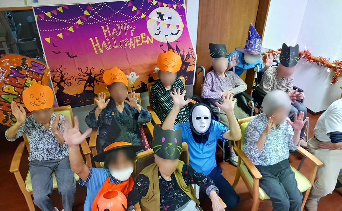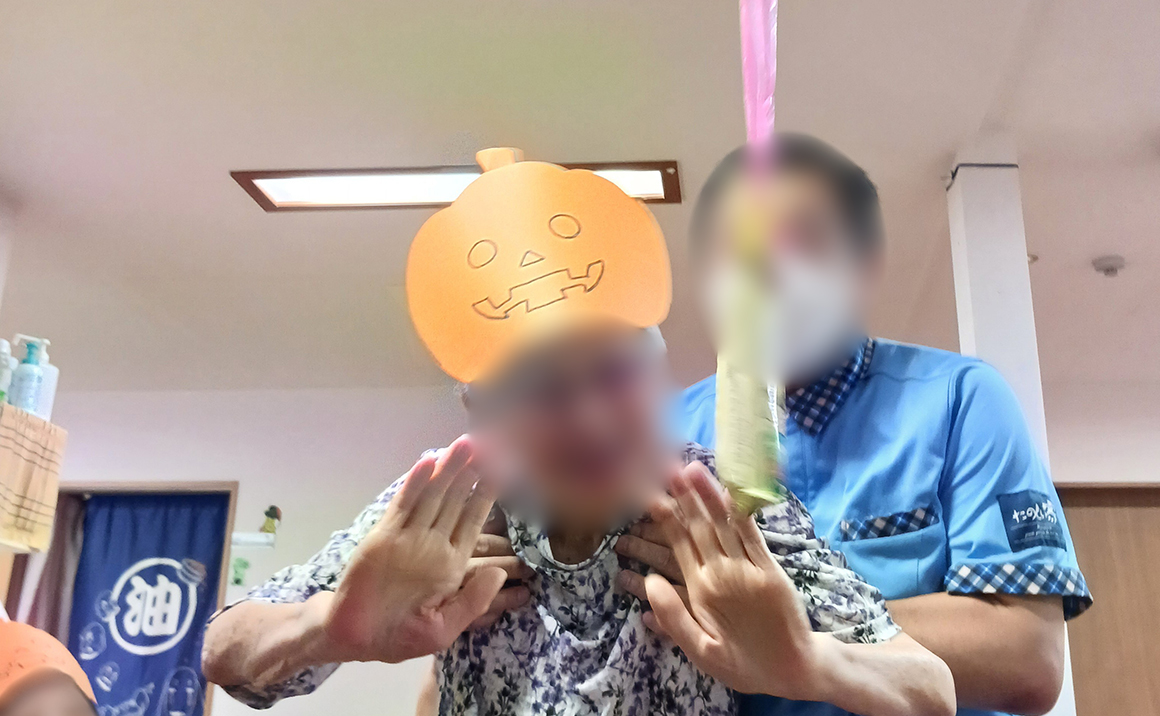たのしい家佐太中町で今年も年に一度のハロウィン運動会を開催しました。 入居者様のみなさんに猫やかぼちゃの手作りのお面をつけてもらい、ボール投げやパン食い競争に見立てたお菓子取り競争を楽しんでいただきました。 来年は新しい種目も考えて、さらに楽しんでもらえるようにしたいと思います。