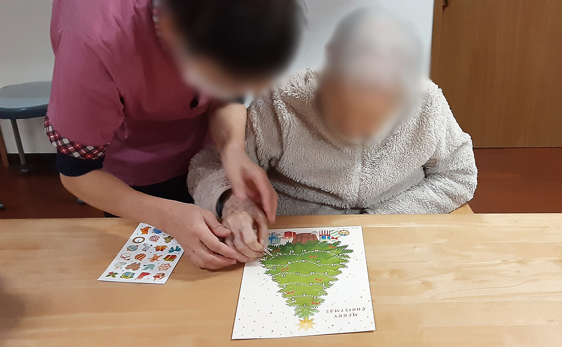 スタッフと共に楽しくクリスマスツリーの絵にシールを貼り付け綺麗に仕上げていました。