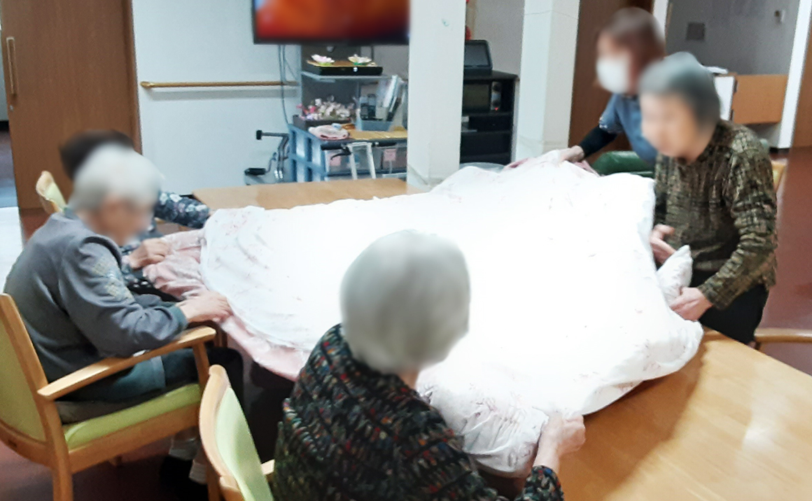 グループホームたのしい家佐太中町 皆様で仲良く布団のカバーつけ