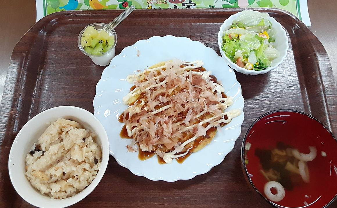 とのことで、タケノコごはんと春キャベツを使ったミニお好み焼を皆さんで作りました。