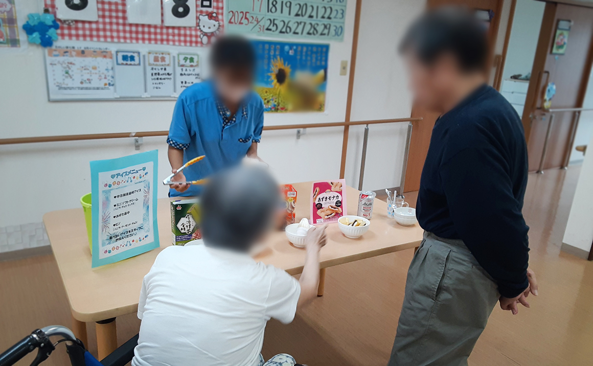 こんにちは!楽しい家七隈の幸田です♥ 今月は皆様待ちに待ったアイスバイキングを開催しました~! 去年はかき氷を皆で食べましたが、今年はアイスにしてみました♪ 4種類のアイスを用意し、好きなアイスを選ぶスタイルです! やはり人気なのは小豆最中!あんこが好きな皆様は大喜びでした♥ T様が「アイスやらここで売ってくれたらいつでも食べれるとにね~」と一言。 その気持ち、とっっっっっても分かります!!!!笑