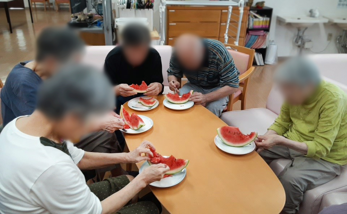 こんにちは!楽しい家七隈の幸田です♥ 夏といえばこのイベント!毎年恒例のスイカ割りをしました~♪ 今年もスタッフが大きなスイカを買ってきてくれました!! 去年はなかなか割れませんでしたが、今年は男性利用者様の協力もあり 見事に割る事ができました!! 割れたスイカを見て「早く食べたい!」と大盛り上がり!! 席に戻って食べる予定が、そのまま皆で食べちゃいました笑 忘れられない、最高の夏の思い出になりました♥