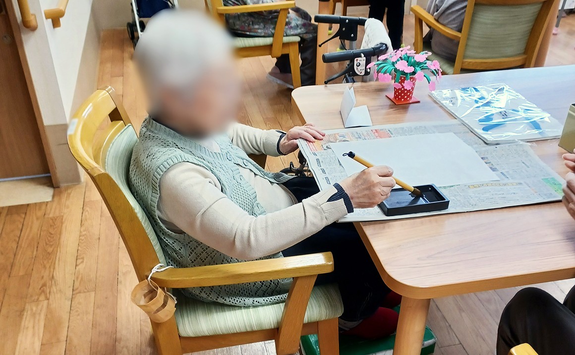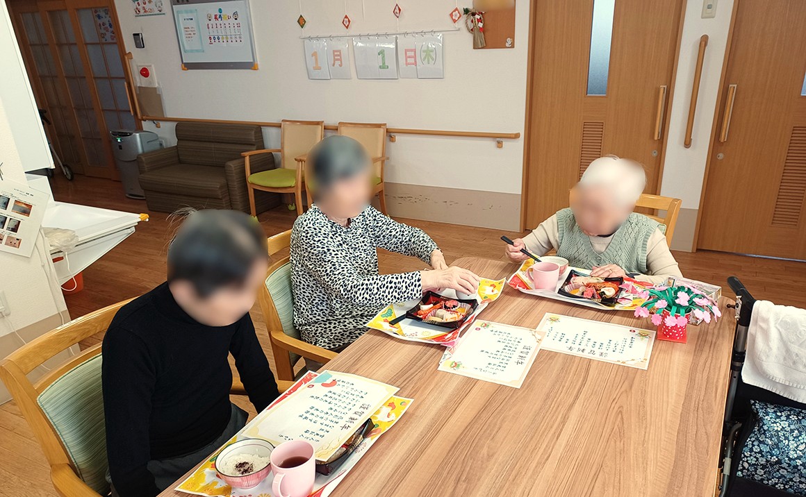 たのしい家西陣のお正月は、入居者の皆様におせち料理の特別メニューを提供し、書初めをしていただきました。