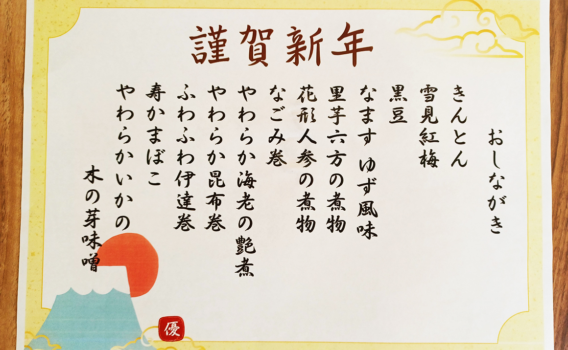 おせち料理はしっかりメニュー表を用意しました。メニュー表のあまりのクオリティの高さに、このメニュー表持って帰らせてくださいという方が数人いらっしゃいました。