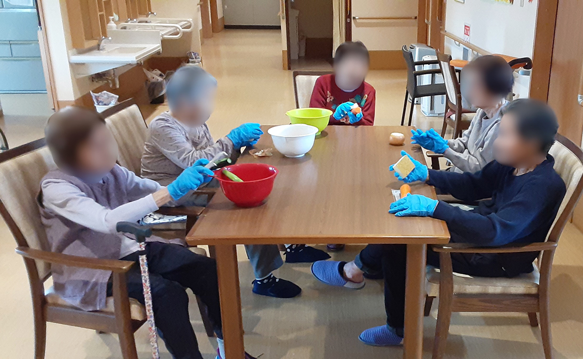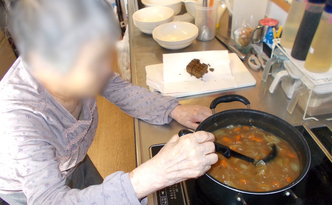 たのしい家鶴里では、手続き記憶や実行機能への促しや、手先を動かす事での脳の活性化を目的として今月より月に1度カレーの日を始めました。 カレーの日では、ご利用者様に野菜の皮むきやカットの他、カレーのルーを混ぜる作業に参加いただき、料理を食べるだけでなく作る楽しみや喜びを共有することができました。