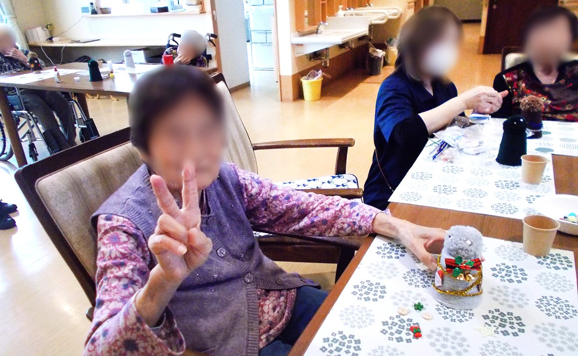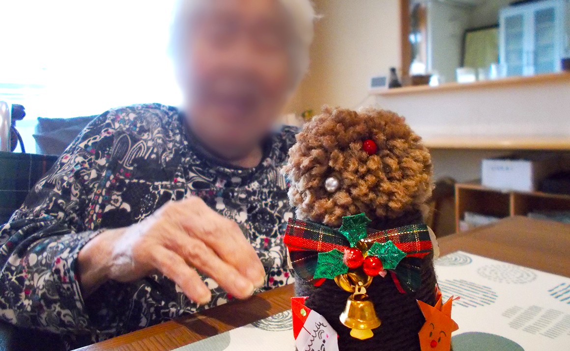 クリスマス本番まで2週間をきりましたが、たのしい家鶴里では、15日にボランティアさんをお招きしてクリスマスツリー作りを行いました。 ツリーはボランティアさんが事前に紙コップに毛糸を巻いていただき、毛糸でボンボンも用意して下さりました。 ツリーに利用者様が思い思いに両面テープや、ボンドを使用して飾り付けを行い、どれも可愛らしく出来上がり大変喜ばれておりました。