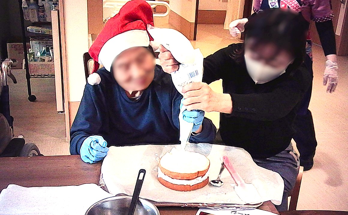 クリスマス会ではご家族様のご協力をいただきながら、ビーフシチュー作りやサンタクロースの顔をモチーフとしたクリスマスケーキ作りを行い、