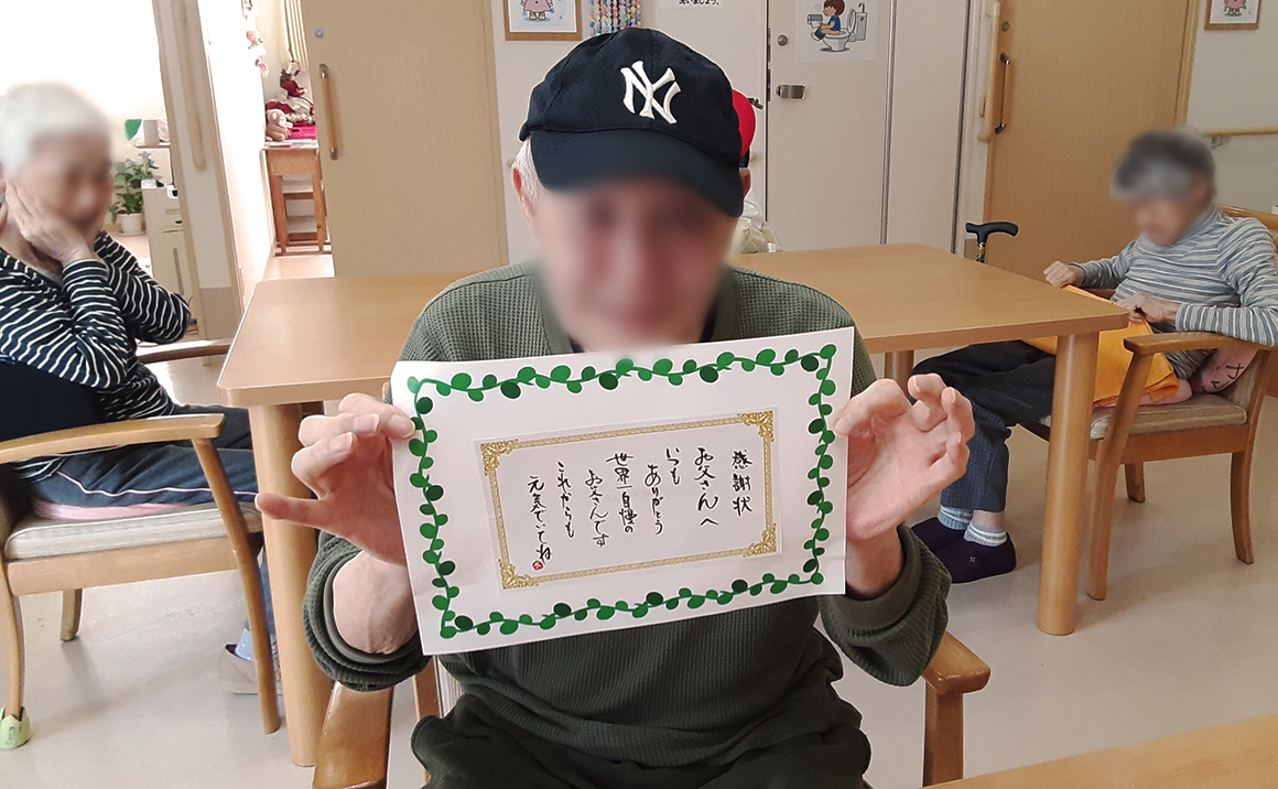 まだ6月にも拘わらず、日中は真夏日が続いております。 朝晩の寒暖差が大きい為、皆様お風邪など召されぬようご自愛くださいませ。 さて、本日6月16日は父の日です。 2名の男性入居者様に日頃の感謝の気持ちを込めて、父の日メニューの昼食、父の日ケーキを召し上がって頂き、感謝状をお渡ししました。 お二人とも少し照れながら受け取って下さりました。