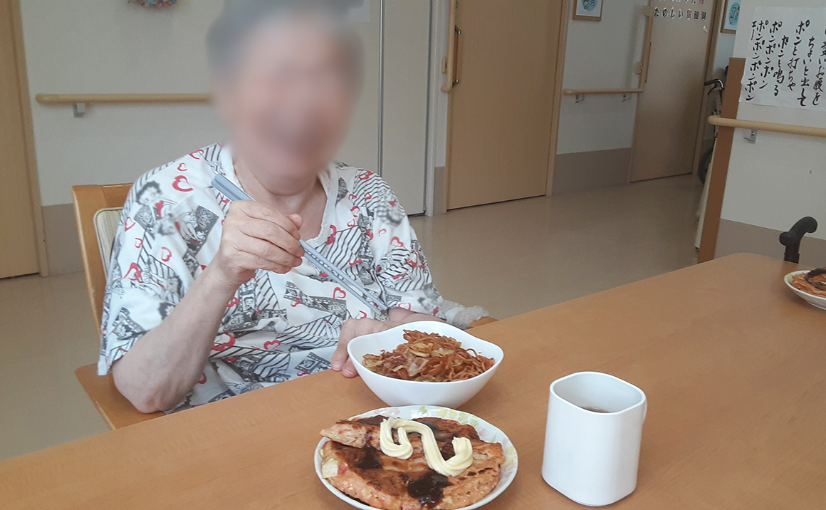 入居者様の目の前で調理させて頂きました。皆様、出来立てあつあつの粉ものを召し上がり、