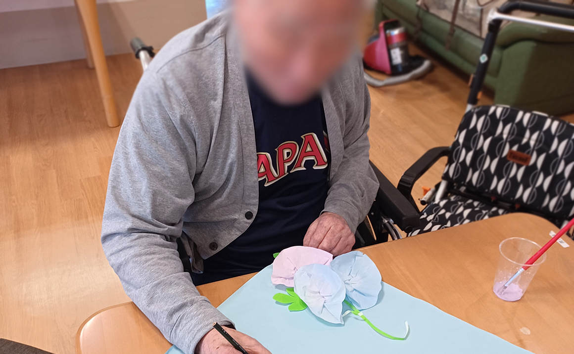 夏らしく朝顔の壁飾りを皆さまと一緒につくりました コーヒーフィルターを使い皆様に色付けをしていただいたり配置を一緒に考えました。 みなさまとても集中して作成に参加されていました。 作った後は尼崎で有名な庄谷のシュークリームをおやつでいただきました。