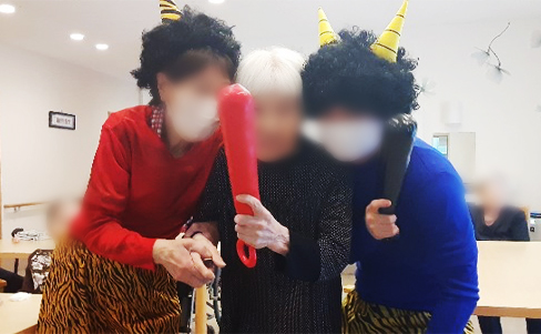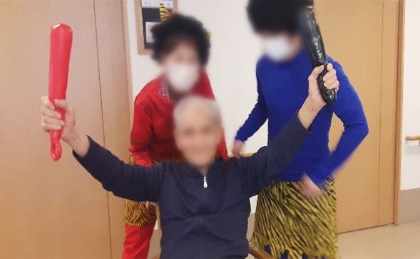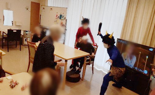 たのしい家西九条での毎年恒例の節分がやって参りました。 投げるのは 大豆の豆ではなく、甘納豆を投げるようにしていますよ♬ 「鬼は~そとぉ!福は~うちぃ!」と元気な掛け声が飛び交います。 ご利用者様は、これでもか!というくらいの勢いでスタッフが扮する鬼に向かって力いっぱい甘納豆を投げていきます。 豆まきの後は、甘納豆を美味しくいただきました♪ご利用者 皆様の無病息災をお祈り申し上げます。