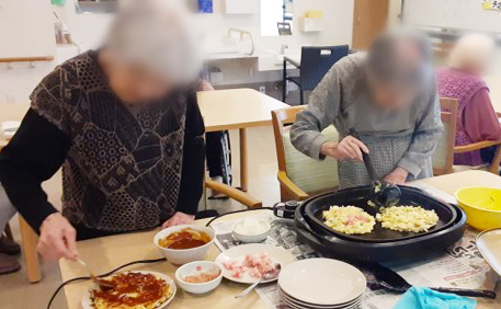焼いたりと 意外と時間が掛かりますよね。そこで スタッフが ご利用者様に「助けて~」と昼食作りのお手伝いを