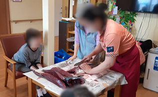 お世話になっております。 たのしい家三鷹牟礼では、7月に魚の解体ショーを行いました。 得意な職員が対応して、市場で仕入れた新鮮なカツオやマグロをさばき、あぶりながら本格的な食事イベントでした。 ご利用者様も興味津々で一緒に参加され、楽しくご満足頂くことができました。