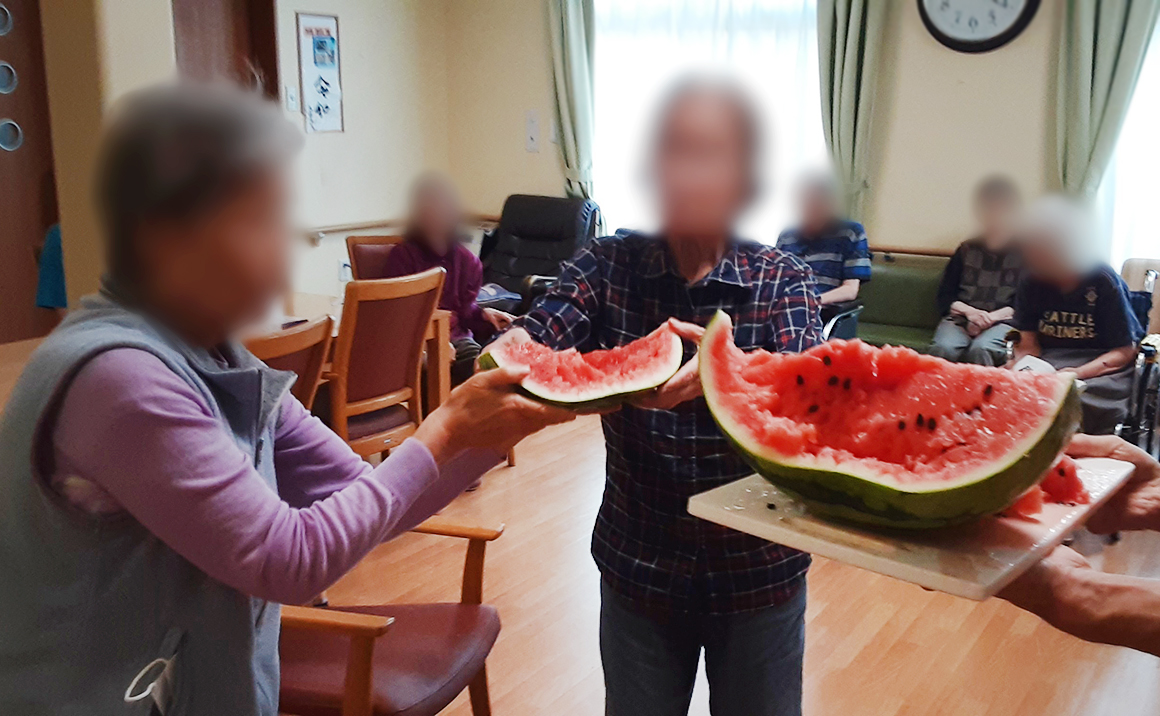お世話になっております。たのしい家三鷹牟礼では、8月にスイカ割りを行いました。 なかなか割れずに苦戦しつつも、皆さんで美味しく召し上がることができました。 今年は例年以上に暑い日が続きますが、熱中症に気をつけつつ隣園にお散歩に行き、 室内での活動も行っていきたいと思います。