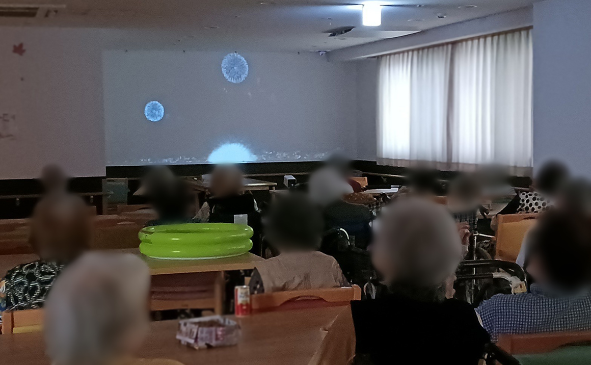プロジェクターで壁に花火大会の動画を写し、 大画面で花火を楽しみました♪