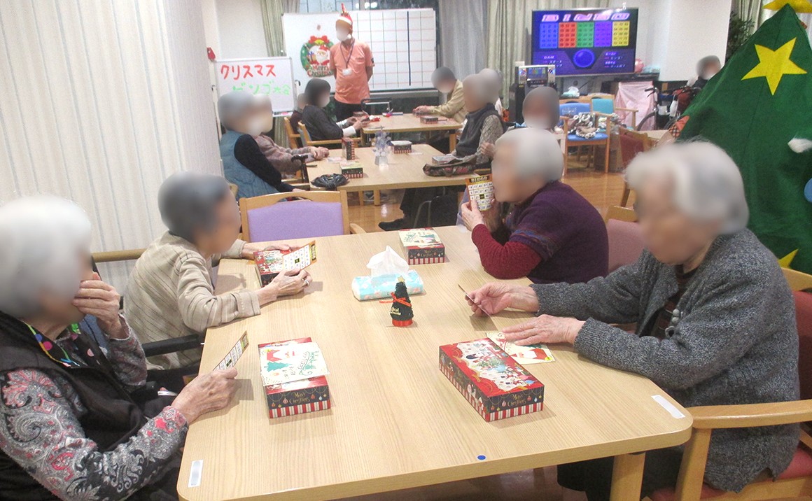 恒例のクリスマスツリーになった職員に出迎えられ、 ビンゴ大会がスタートしました!