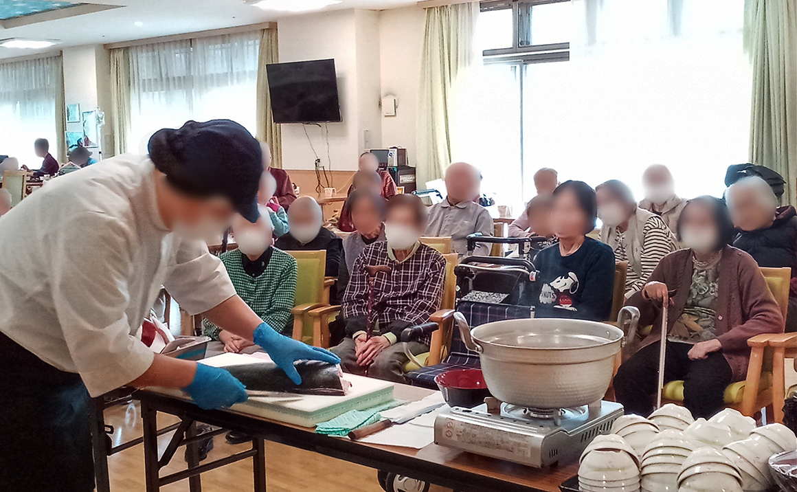 こんにちは プレザンメゾン東起です。 1月26日、毎年恒例「ぶり解体ショー」の様子です。新鮮なぶりを入居者様の目の前でさばき、昼食に提供させていただきました。 何度もお刺身をお替わりすることができる「食べ放題」です。お一人3回程お替わりされ、そのあとはぶりしゃぶを堪能されました。 「美味しくて食べ過ぎてしまったわ~」と皆様とても満足されご機嫌な様子でした。 また来年もお元気にたくさん召し上がってくださいね。