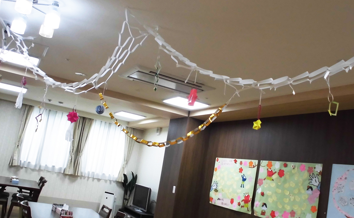 食堂には、職員がきらびやかに飾りを吊ってくれました。