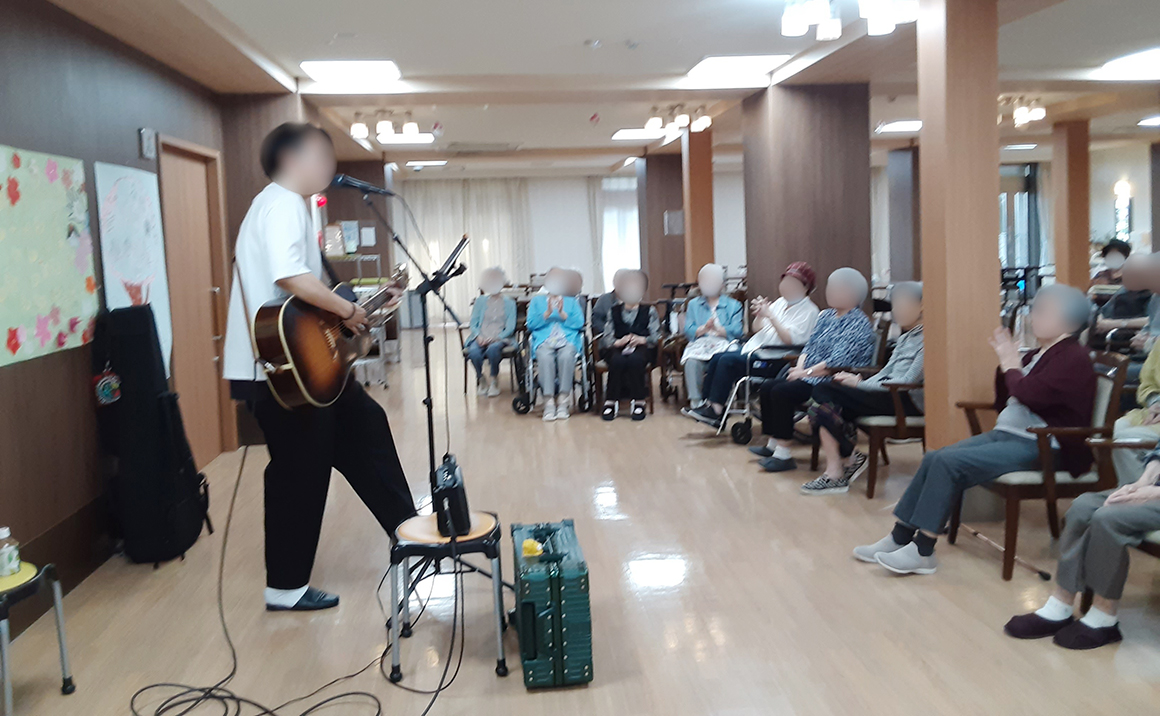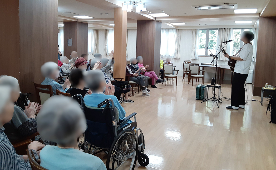 「上を向いて歩こう」「舟唄」「津軽海峡冬景色」「君といつまでも」など利用者様が喜びそうなチョイスで 会場は満面の笑みと拍手喝采でした。