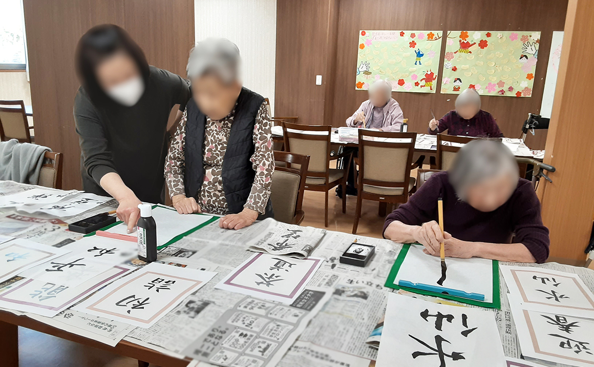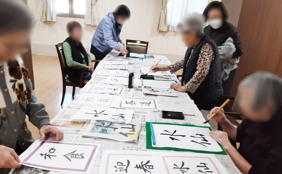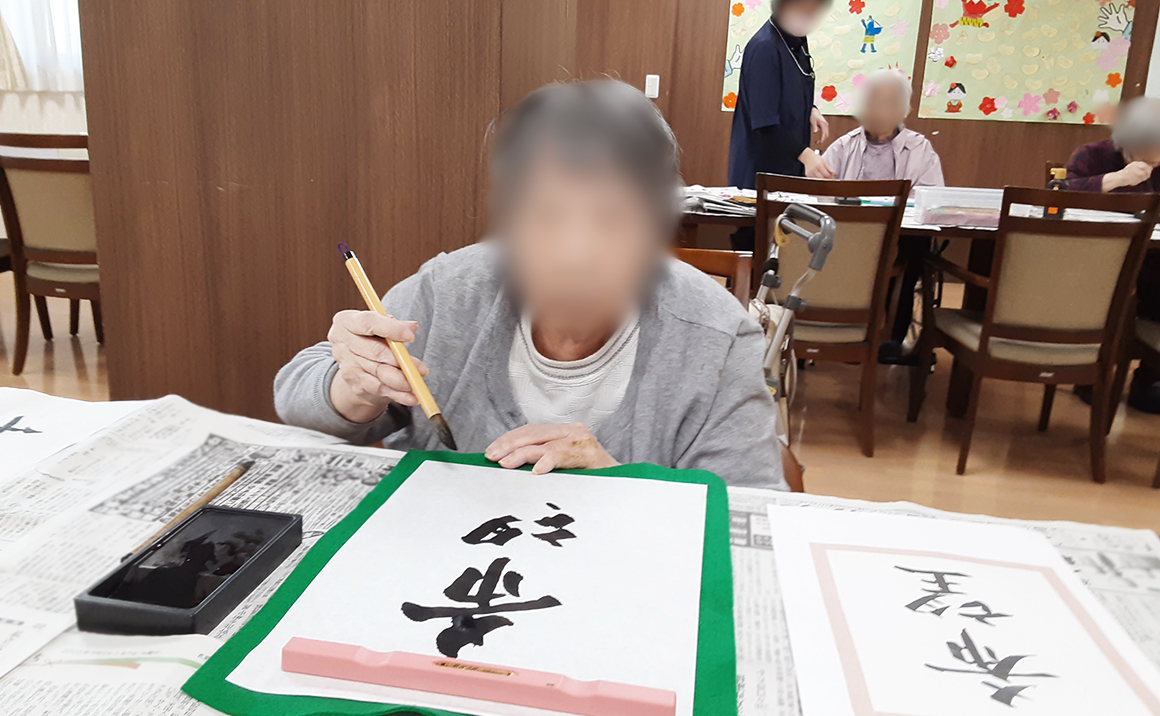 元旦にレクで書初めをやったところ、ご利用者様からの要望が強く、定期的に 書道教室を開くことにしました。
