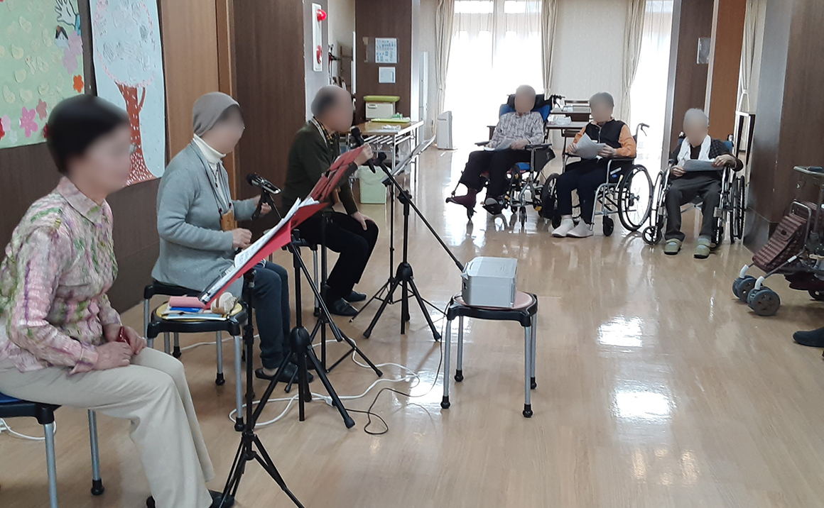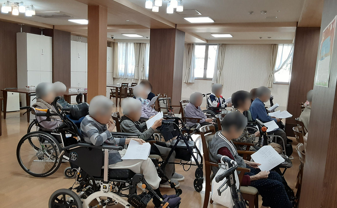 30人くらいのご利用者様が参加して、「高校三年生」「仰げば尊し」「蛍の光」など懐かしい曲を 披露してくれて、皆様満面の笑顔です。