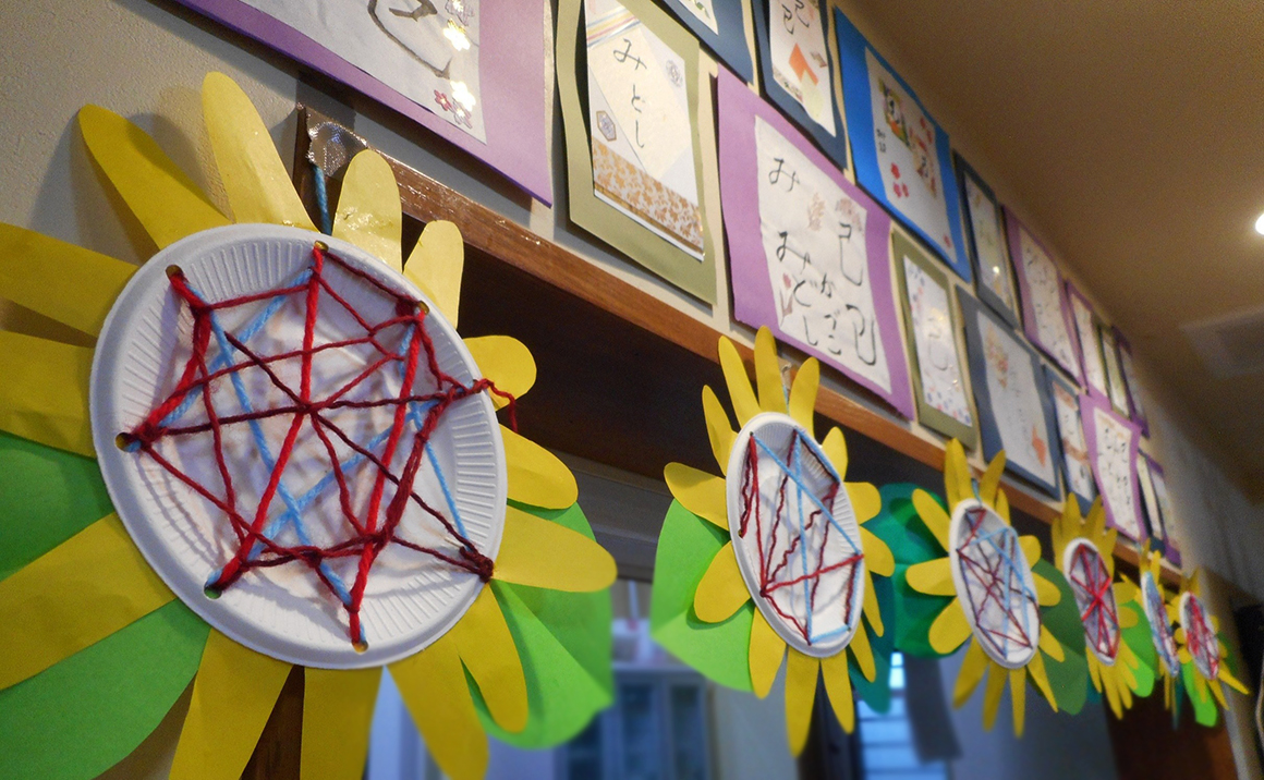 使い捨ての紙のお皿に思い思い毛糸を通します。それに黄色い花びらを並べて出来上がり。