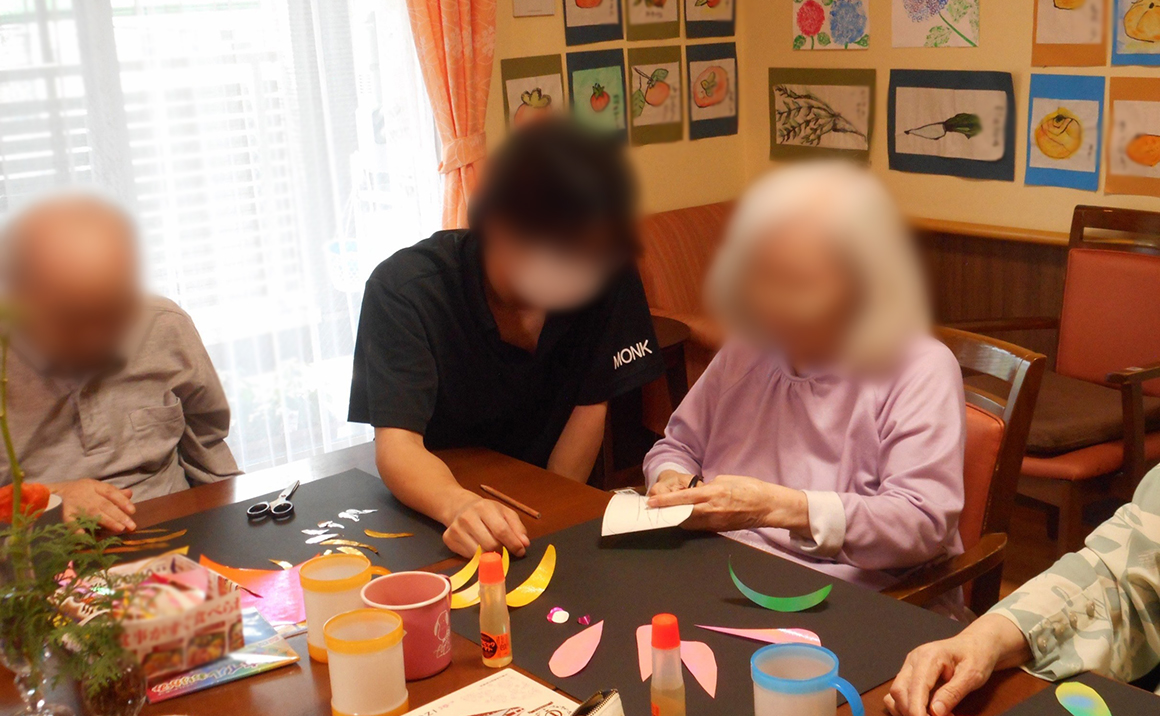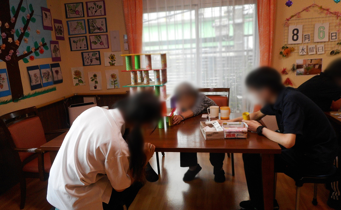 学生さんたちも割とスムースに利用者様の間に入って会話を交わしてくれたり、ゲームや貼り絵などの工作にも一緒にチャレンジしてくれました。
