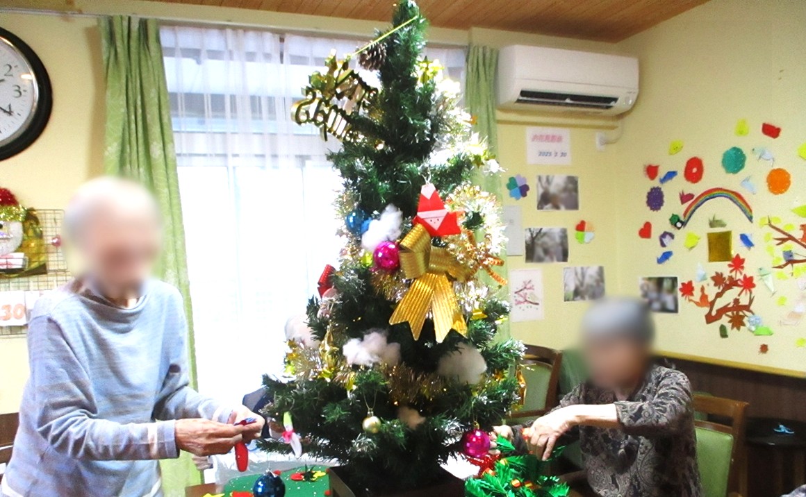 今日は、入居者様と一緒にクリスマスの飾りつけをしました。 ツリーを飾ったり、壁にオーナメントを飾ったりと、 皆さまそれぞれ思い思いに参加してくださいました。