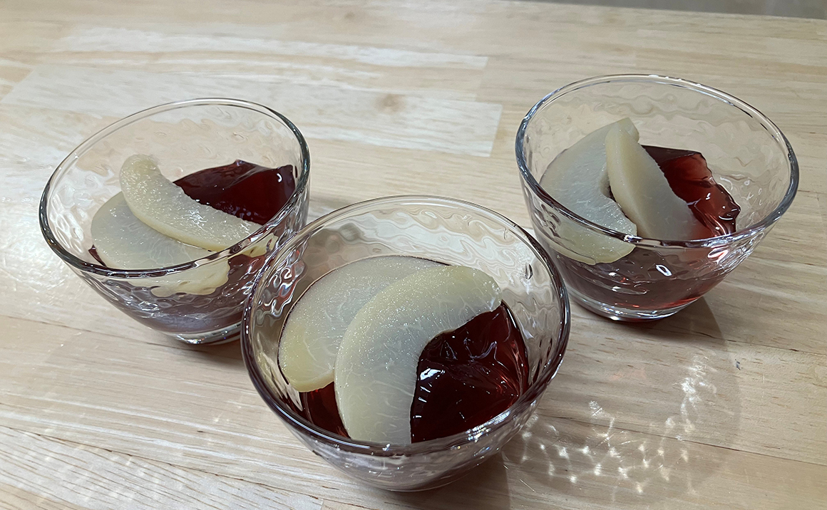 この日のティータイムには、特別メニューとして「赤ワインゼリー白桃添え」をご提供。