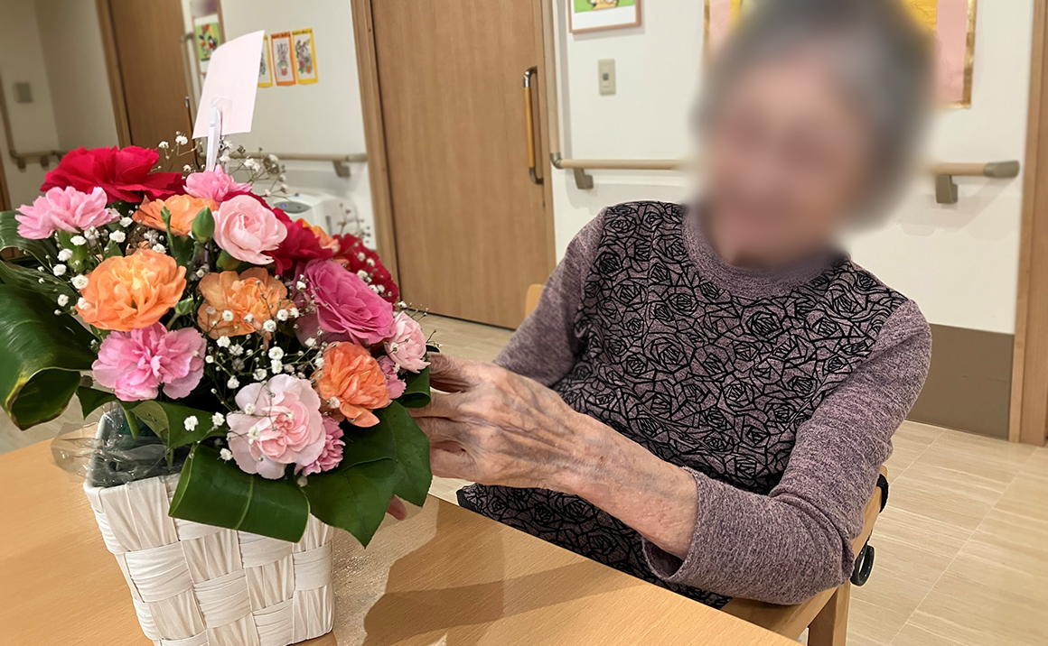 また、ご家族様からお花が届いた入居者様もおられ、お花を眺めながら、にこやかに過ごされるご様子に、ご家族の温かさを感じた1日でした。