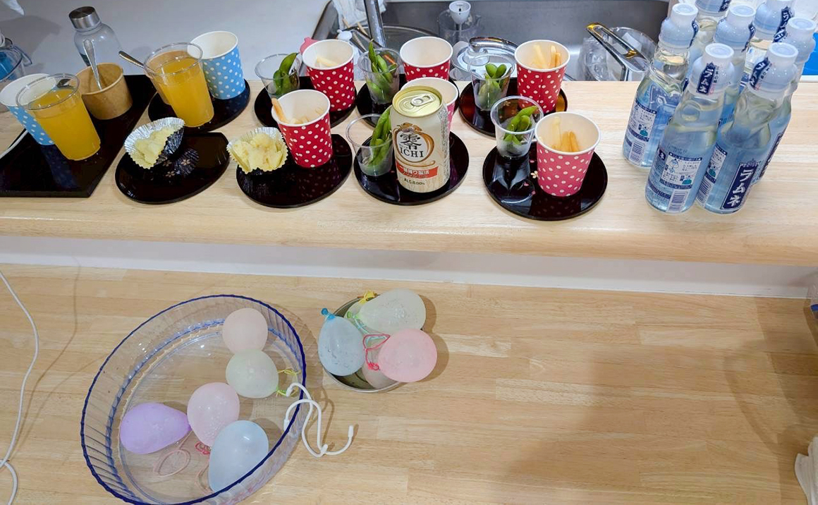 屋台気分を味わっていただこうと、サイダーやポテト、枝豆などのお祭りメニューもご用意。「冷たくておいしい」「昔のお祭りを思い出すね」と喜んで召し上がっていただきました。