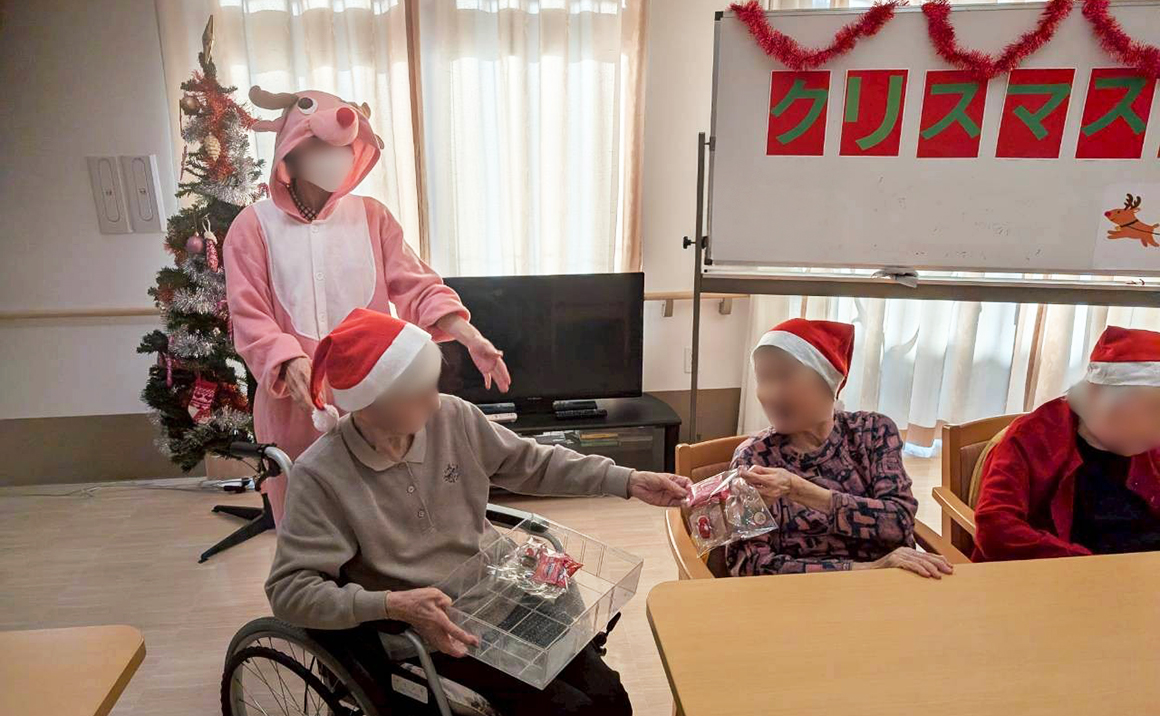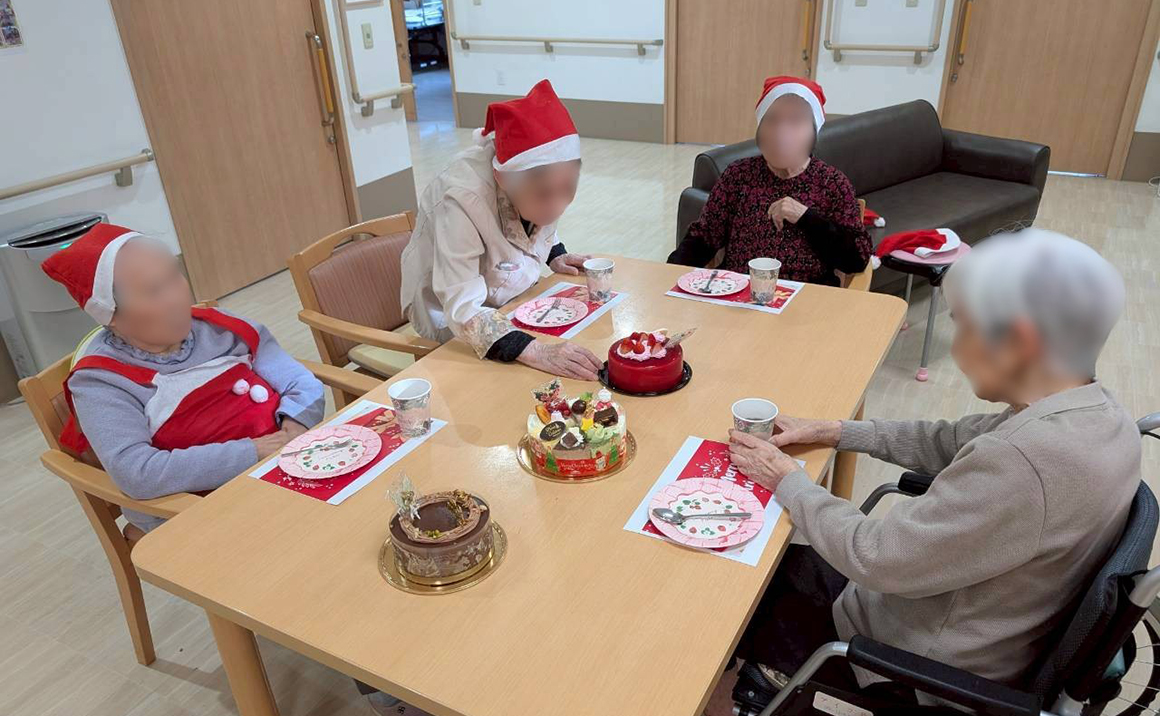 12月25日に入居者の皆様と一緒にクリスマス会を開催いたしました。 皆様にサンタ帽子をかぶっていただき、いつもより少し特別な雰囲気の中でスタート♪ 定番のクリスマスソング「ジングルベル」を合唱したり、プレゼントをお渡ししたり、おやつの時間にはクリスマスケーキをご用意♪ 笑顔と笑い声に包まれたクリスマス会となりました。