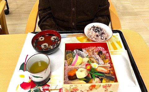 昼食には華やかなおせち料理をご用意。「きれいね」「どれから食べようか」と会話も弾み、ゆっくりとお正月気分を楽しまれていました。