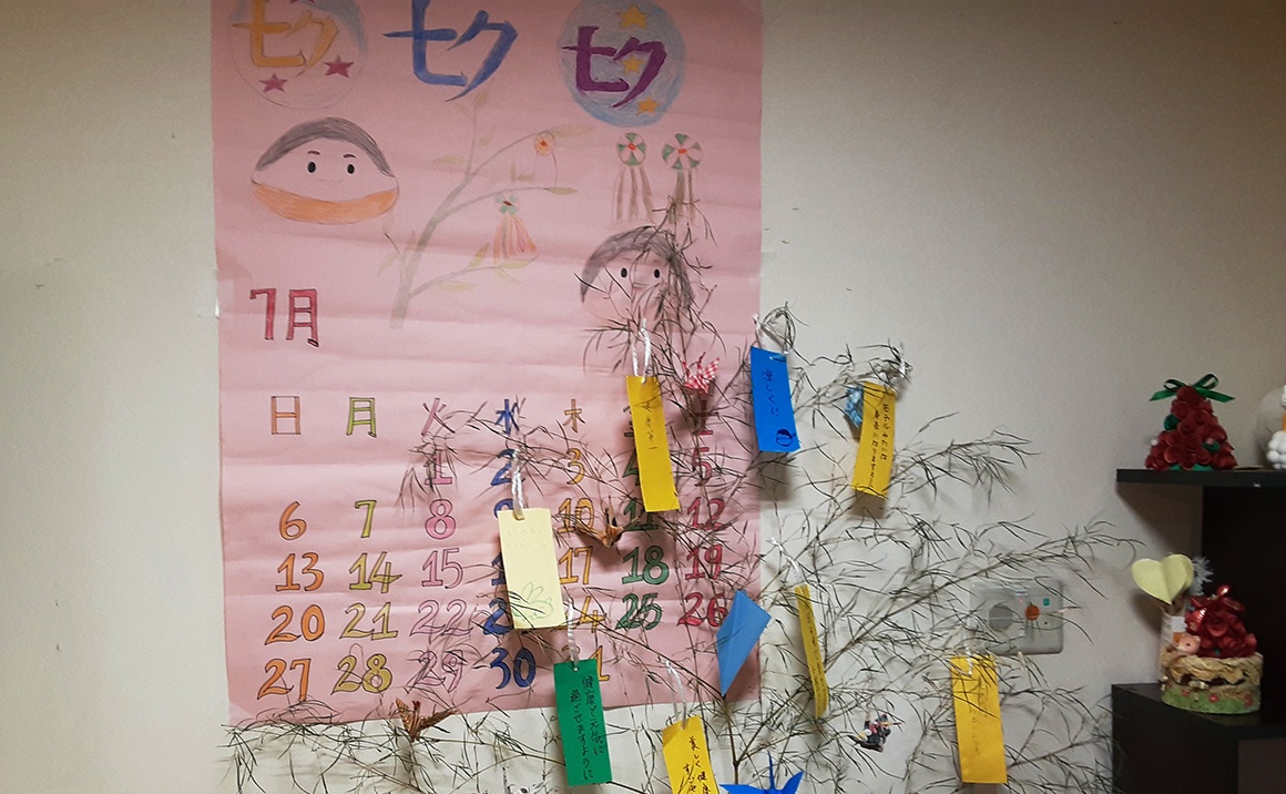 七夕に願いを込めて、ご入居者様の願いを短冊に書いていただきました。 世界中の平和やお体の健康など様々な願いが書かれていました。 施設から見る夜空は周りに高い建物もなく、お天気の良い日だと月や星がきれいに見ることが出来ます。 今年の七夕の日は曇りでしたが、皆様のお願いが広い夜空を渡り天の川に届きますように。 そして皆様が健康で穏やかに過ごせる日々をお祈りいたします。