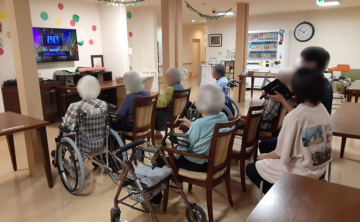 歌がお好きなご入居者様が集まりカラオケをしています。 今回は介護体験の学生さんも交えカラオケが始まりましたが、大学生なので年齢も20歳前後と若く「こんな歌は知らない」など言いながらも手拍子をしながら、 ご入居者の皆様と一緒にカラオケを楽しみました。