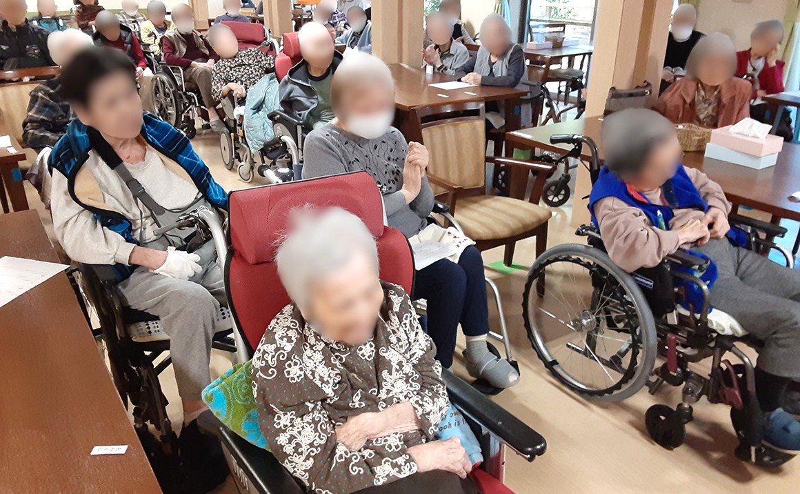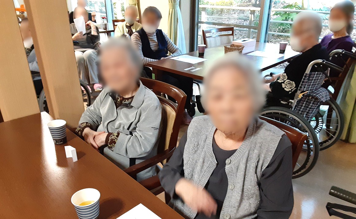 1月4日は新年会を行いました。職員による二人羽織。お手製の開運おみくじも引いていただきました。