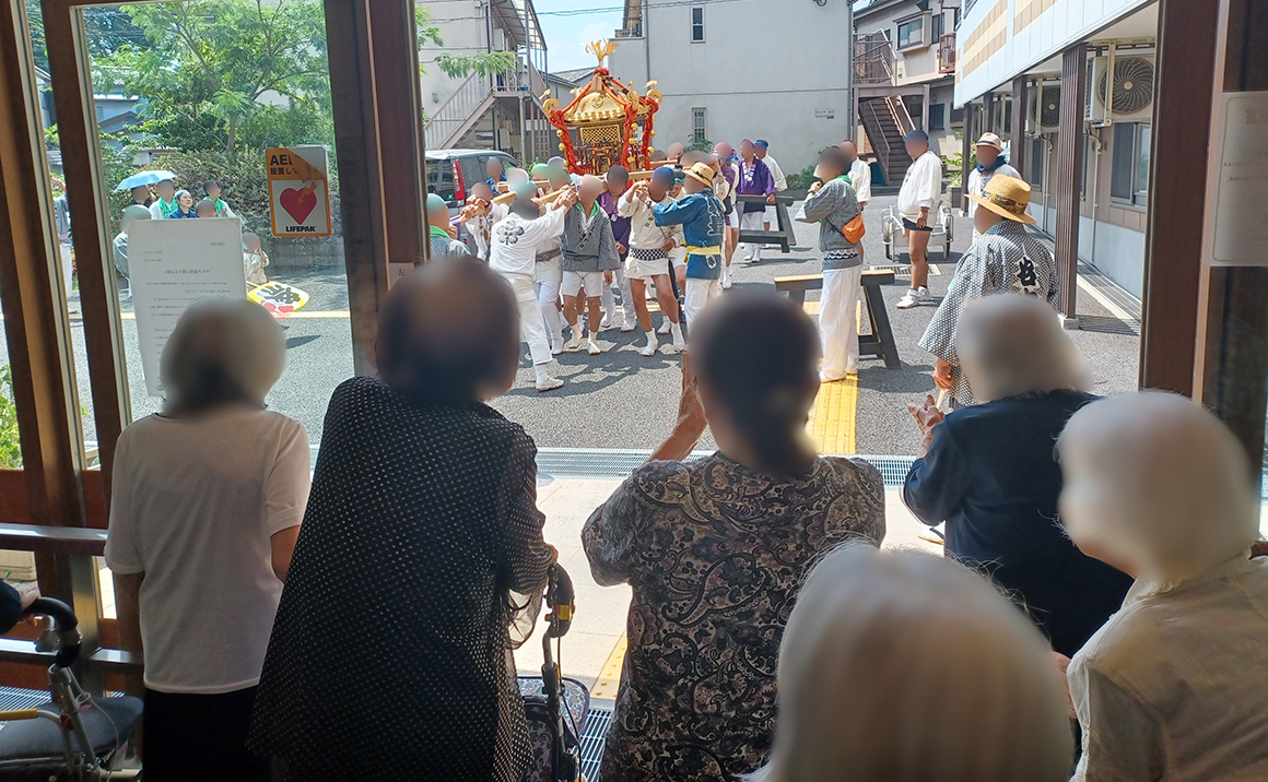 先日、谷中では町内会のお神輿が施設に来ました。同じ日に納涼祭を行いました(^▽^)/ 1枚目はお神輿の様子です。 2枚目、3枚目のお写真は納涼祭のゲームの様子です。