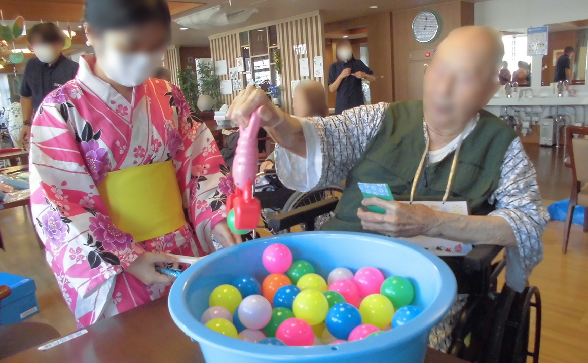 ゲームは ボウルすくい。魚釣りゲーム。輪投げに、的あてと入居者様に楽しんで頂きました。 ベトナムの技能実習生には浴衣を着てもらいゲームのアシスタントで活躍してもらいました。!(^^)! その一部をご紹介致します~(*´▽`*)