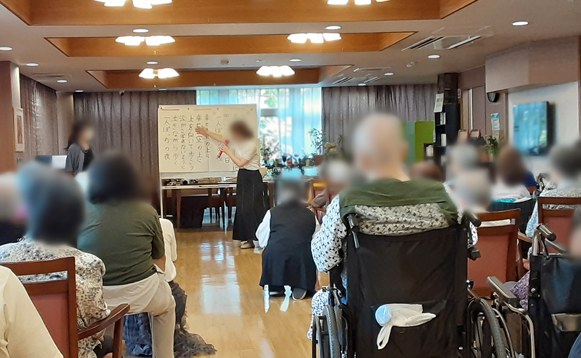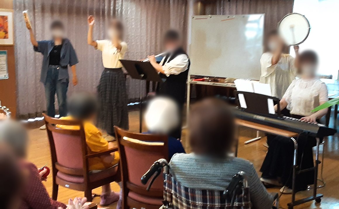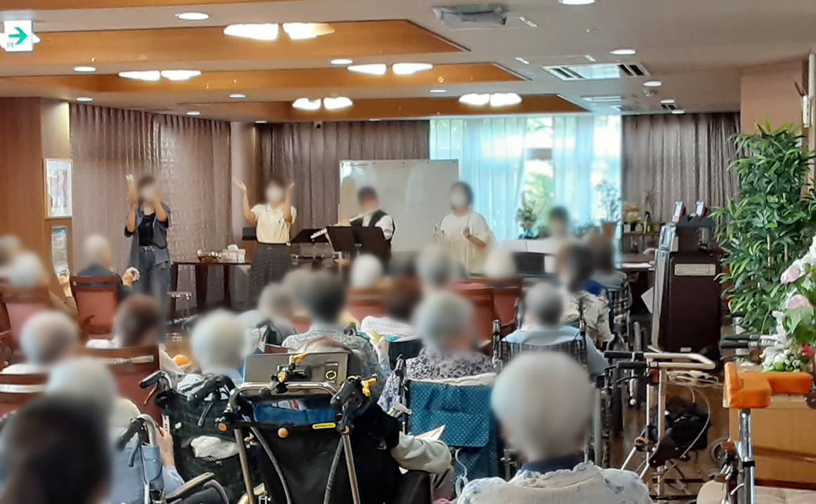 プレザングラン台東谷中で先日行われた。 上野にある上野学園短期大学の音楽履修生による 『秋のアフタヌーンコンサート』を開催して頂きました。 その時の様子をお伝えします(*^▽^*) 施設の入居者様に合わせて馴染みのある曲ばかり6曲を準備して頂き、 楽器の演奏。脳トレ、リズム体操、歌唱など。入居されているほとんどの入居者様が参加され、 楽しい時間を過ごしました。
