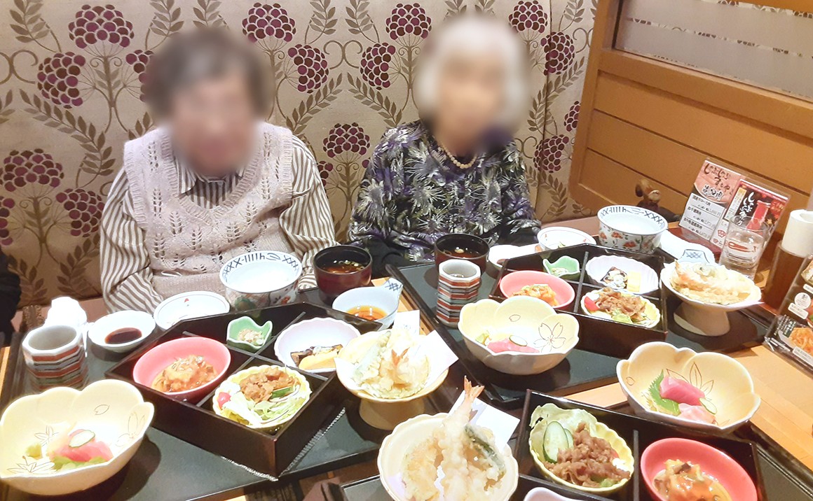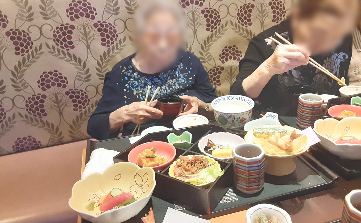 お食事のランチメニューの「天ぷらはサクサクで美味しいわ。」お刺身盛り合わせも美味しい。 会話も楽しみつつ召し上がっていました。 施設のお食事よりボリューム感あったのでですが、皆さん完食されていました。