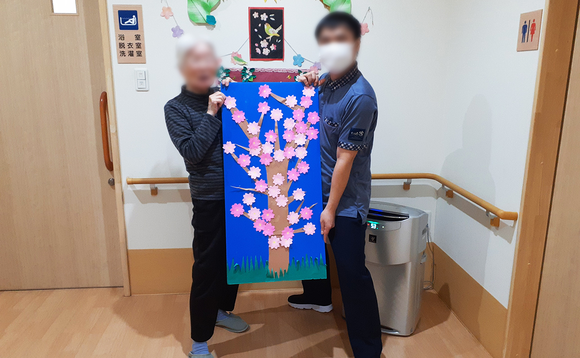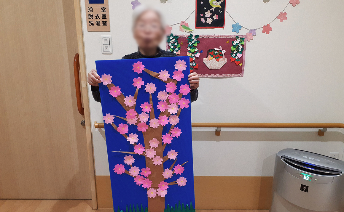 3月も下旬になり、桜がいつ咲くのかなぁと職員も入居者様も気にしだす時期になり、桜の飾りを作りました。 特に新調したわけではなく数年前にご家族様が、みんなで作れるようにと 手作りで持ってきてくださった飾りの木に桜の花を貼っていき満開にしました。 完成した作品と満面の笑みで記念撮影をしました。