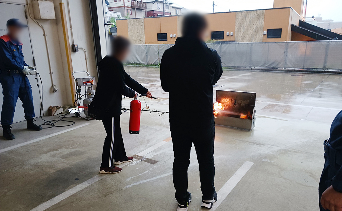 今回は夜勤専従の職員や夜勤をしている技能実習生と共に地域の消防署での体験型の訓練に行き、