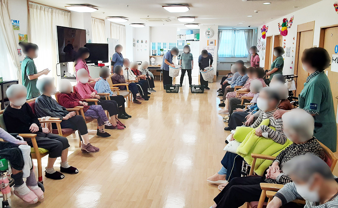 職員も一緒に楽しみながらサポート行いました。皆様笑顔が絶えず、他の階のご利用者様と談話される事も😊!